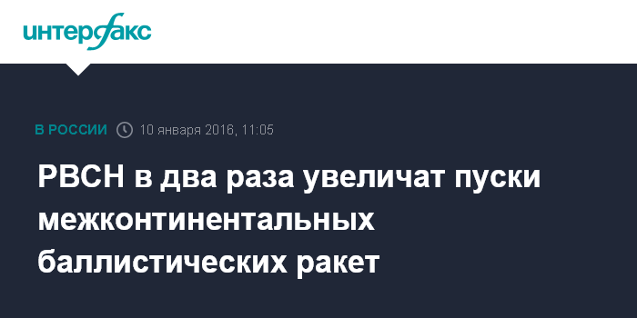 Москва. 10 января. INTERFAX.RU – В 2016 году Ракетные войска стратегического назначения (РВСН) планируют увеличить количество испытательных пусков межконтинентальных баллистических ракет (МБР), сообщил в воскресенье "Интерфаксу" представитель РВСН майор Дмитрий Андреев.