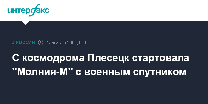 Москва. 2 декабря. INTERFAX.RU - Стартовые расчеты Космических войск РФ утром во вторник осуществили с космодрома Плесецк (Архангельская область) пуск ракеты-носителя среднего класса "Молния-М" со спутником военного назначения, сообщил "Интерфаксу-АВН" помощник командующего Космическими войсками подполковник Алексей Золотухин.