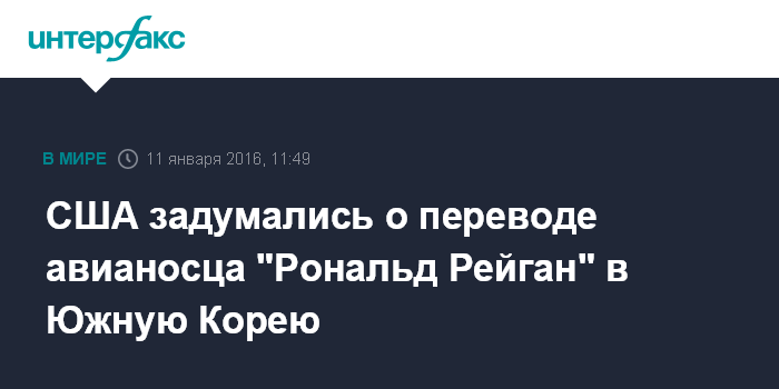 Москва. 11 января. INTERFAX.RU - Пентагон допускает возможность размещения в Южной Корее авианосца "Рональд Рейган" (CVN-76) в рамках планов по усилению американского военного присутствия в связи с объявленным КНДР испытанием водородной бомбы, сообщает южнокорейское агентство "Ренхап".