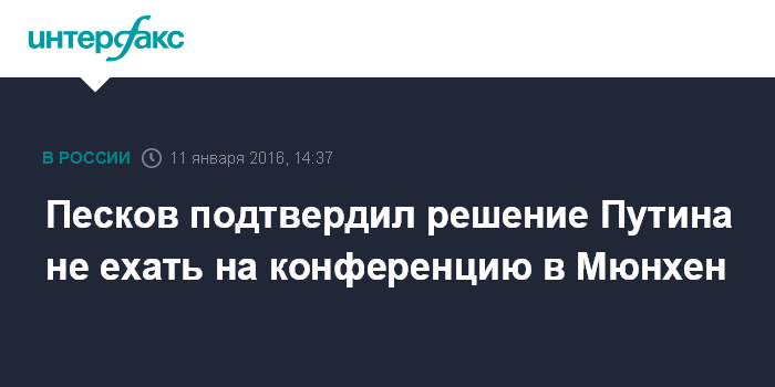 Москва. 11 января. INTERFAX.RU - Президент РФ Владимир Путин не планирует в текущем году ехать на Мюнхенскую конференцию по безопасности, заявил пресс-секретарь российского лидера Дмитрий Песков.