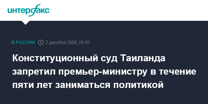Москва. 2 декабря. INTERFAX.RU - В Таиланде конституционный суд запретил премьер-министру страны Сомчаи Вонгсавату заниматься политической деятельностью в течение пяти лет, передает во вторник утром британский телеканал "Скай-ньюс".