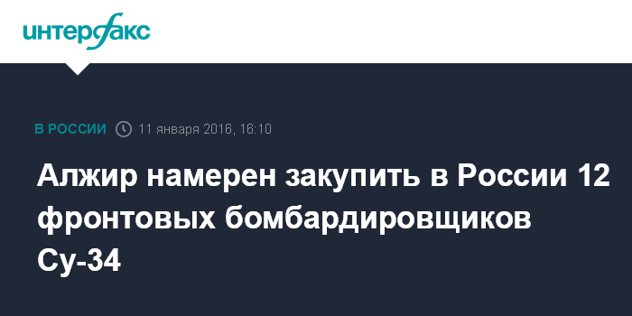 "ВВС Алжира сделали заказ на 12 фронтовых бомбардировщиков Су-34, которые производятся на Новосибирском авиазаводе им. В.П.Чкалова - филиале компании "Сухой", - говорится в сообщении американского интернет-портала Defense News со ссылкой на директора авиазавода Сергея Смирнова. Этой информацией Смирнов накануне Нового года поделился с новосибирскими СМИ.