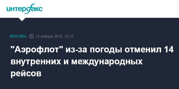 Москва. 12 января. INTERFAX.RU - Авиакомпания "Аэрофлот" отменяет 14 рейсов из-за снегопада и усиления юго-восточного ветра до 17 м/с, сообщается во вторник на официальном сайте авиаперевозчика.