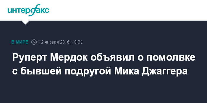 Москва. 12 января. INTERFAX.RU - Американский медиамагнат Руперт Мердок объявил о помолвке с 59-летней бывший моделью Джерри Холл. Соответствующее объявление было размещено в очередном номере британской газеты The Times, которая принадлежит 84-летнему Мердоку.