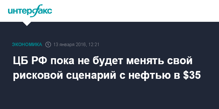 Москва. 13 января. INTERFAX.RU – ЦБ РФ пока не видит необходимости в пересмотре рискового сценария, где заложена цена нефть в $35 за баррель, но отмечает, что вероятность его реализации повысилась с момента декабрьского заседания совета директоров.