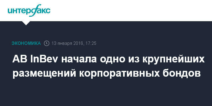 Москва. 13 января. INTERFAX.RU – Бельгийская пивоваренная компания AB InBev в среду начала одно из самых масштабных размещений корпоративных облигаций в истории рынка, чтобы профинансировать сделку по приобретению британской SABMiller, сообщает агентство Bloomberg со ссылкой на информированные источники.