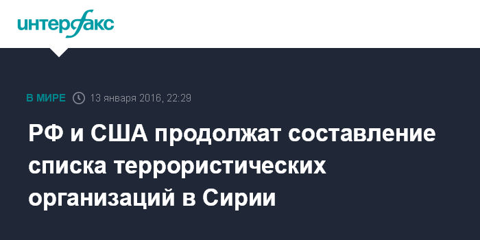 Москва. 13 января. INTERFAX.RU - США и РФ ведут работу по составлению списка террористических организаций в Сирии, эта работа еще не закончена, заявила помощник госсекретаря по Ближнему Востоку Энн Паттерсон.