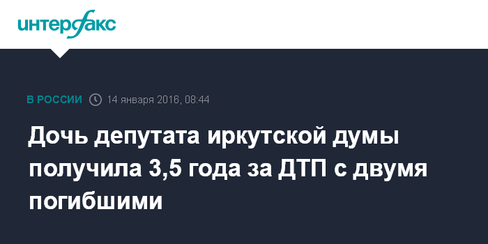 Москва. 14 января. INTERFAX.RU – Иркутский суд в четверг приговорил к 3 годам и 6 месяцам лишения свободы дочь депутата думы Иркутска, которая стала участником ДТП с двумя погибшими, сообщили агентству Интерфаксу в пресс-службе управления СКР по региону.