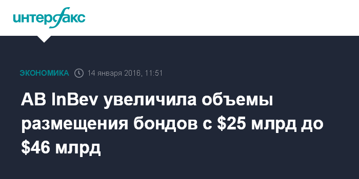 Москва. 14 января. INTERFAX.RU – Бельгийская пивоваренная компания AB InBev увеличила объемы размещения облигаций с $25 млрд до $46 млрд в рамках второй по величине среди подобных сделок в истории рынка.