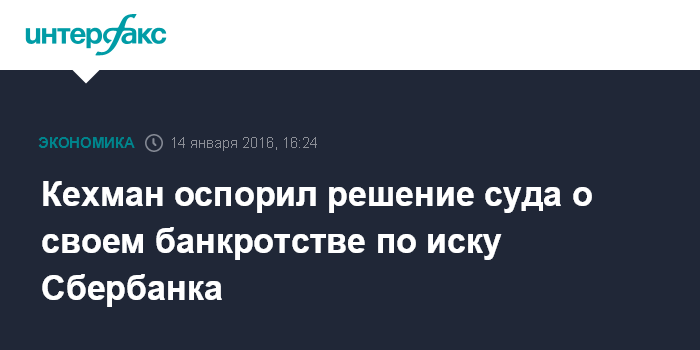 Как сообщалось, 17 декабря 2015 года арбитраж Петербурга и Ленинградской области признал иск Сбербанка о банкротстве Кехмана обоснованным и ввел в отношении него процедуру реструктуризации долга. Решением суда в реестр требований кредиторов были включены требования Сбербанка в размере 4,316 млрд рублей.