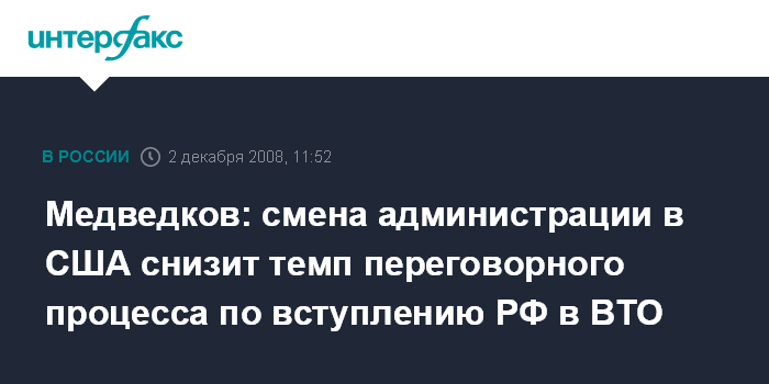 Москва. 2 декабря. INTERFAX.RU - Смена администрации в США неизбежно снизит темп переговорного процесса по присоединению РФ к ВТО, считает глава российской делегации на переговорах Максим Медведков.