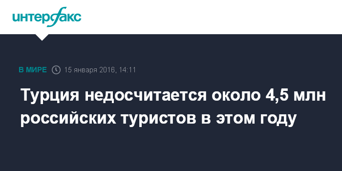 Москва. 15 января. INTERFAX.RU - В Турции посчитали, что страна потеряет около 4,5 млн туристов из России в этом году, сообщает издание Hurriyet со ссылкой на министра культуры и туризма страны Махира Унала.