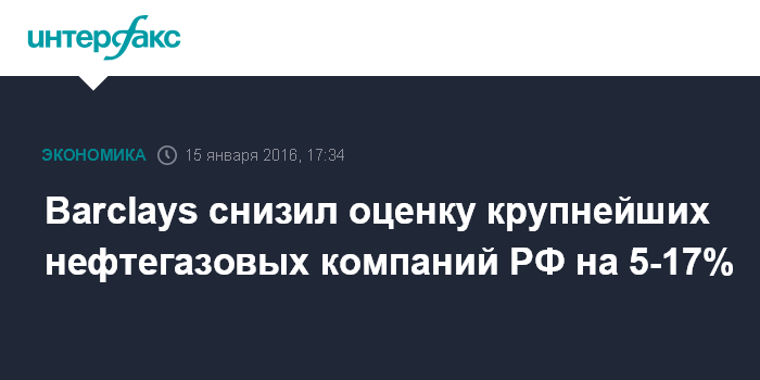 Москва. 15 января. INTERFAX.RU – Barclays Capital понизил прогнозные цены депозитарных расписок "Газпрома", "ЛУКОЙЛа", "НОВАТЭКа" и "Роснефти" на 5-17%, сообщается в обзоре инвестбанка.