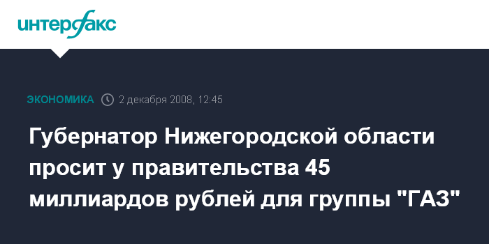 Москва. 2 декабря. INTERFAX.RU - Губернатор Нижегородской области Валерий Шанцев обратился в правительства РФ с просьбой о господдержке для группы "ГАЗ" в размере 45 млрд рублей.
