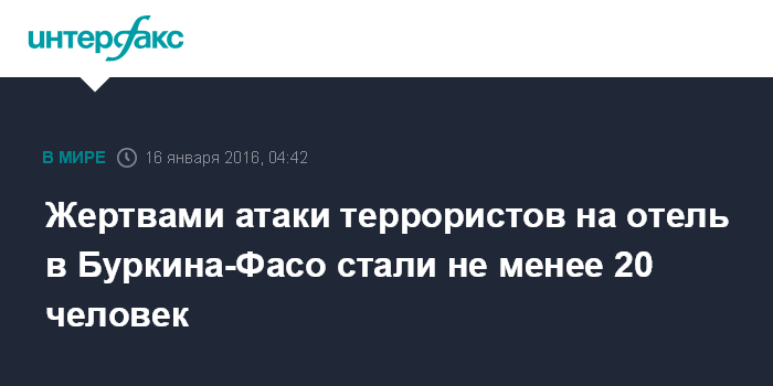 Москва. 16 января. INTERFAX.RU - По меньшей мере, 20 человек стали жертвами нападения террористов на отель в Уагадугу - столице Буркина-Фасо, сообщают СМИ с места событий со ссылками на местных медиков.