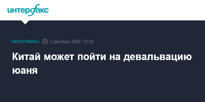 Москва. 2 декабря. INTERFAX.RU - Китайский центробанк может пойти на девальвацию юаня, чтобы содействовать росту экспорта и развитию экономики страны, сообщила центральная китайская газета "Жэньминь жибао".