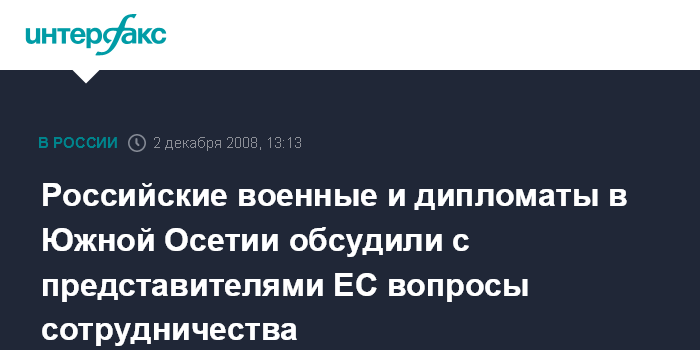 Москва. 2 декабря. INTERFAX.RU - Представители рабочей группы Минобороны и МИД РФ встретились во вторник в населенном пункте Эргнети (Южная Осетия) с представителями мониторинговой миссии Евросоюза в Грузии, сообщил "Интерфаксу-АВН" заместитель главнокомандующего Сухопутными войсками генерал-лейтенант Валерий Евневич.