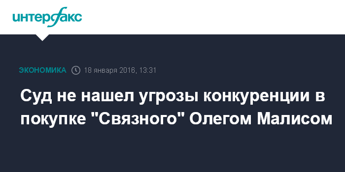 Москва. 18 января. INTERFAX.RU – Приобретение Олегом Малисом контроля над ритейлером "Связной" не повлекло за собой ограничение конкуренции на рынках продажи абонентских контрактов и смартфонов - к такому выводу пришел Московский арбитраж, рассмотрев иск МТС и ее розничной "дочки" "Русская телефонная компания" (РТК) к ФАС.