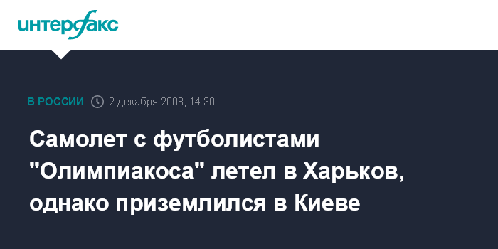 Москва. 2 декабря. INTERFAX.RU - Самолет с командой греческого футбольного клуба "Олимпиакос" (Афины) не сумевший из-за метеоусловий приземлится в Харькове, куда команда летела на мачт с местным "Металлистом в 11:50 сел в международном Аэропорту "Борисполю"