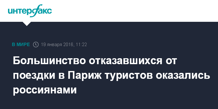 Москва. 19 января. INTERFAX.RU - Граждане РФ возглавляют список туристов, отказавшихся от поездок в Париж после терактов 13 ноября, пишет на своем сайте французская газета Le Monde.