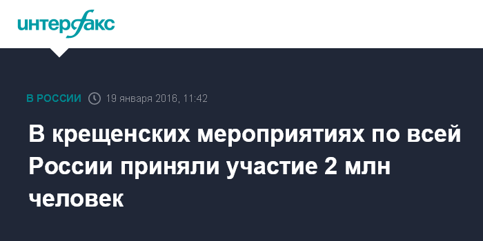 Москва. 19 января. ИНТЕРФАКС - Около 2 млн человек участвовали в России в мероприятиях по случаю Крещения Господня, сообщили "Интерфаксу" в пресс-центре МВД.