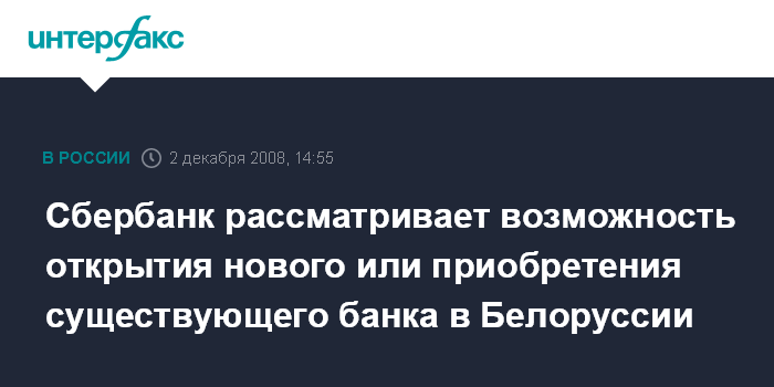 Москва. 2 декабря. INTERFAX.RU - Сбербанк Российской Федерации в ближайшее время рассмотрит возможность открытия нового или приобретения существующего в Белоруссии банка, заявил председатель правления Сбербанка Российской Федерации Герман Греф журналистам во вторник в Минске после встречи с президентом Александром Лукашенко.