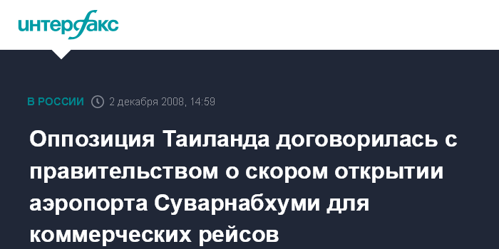 Москва. 2 декабря. INTERFAX.RU - Лидеры антиправительственных выступлений в Таиланде объявили во вторник о готовности открыть терминал аэропорта Суварнабхуми для коммерческих рейсов.