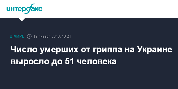 Москва. 19 января. INTERFAX.RU - Министерство здравоохранения Украины подтверждает 51 случай летального исхода, связанного с заболеванием гриппом, сообщил глава ведомства Александр Квиташвили.