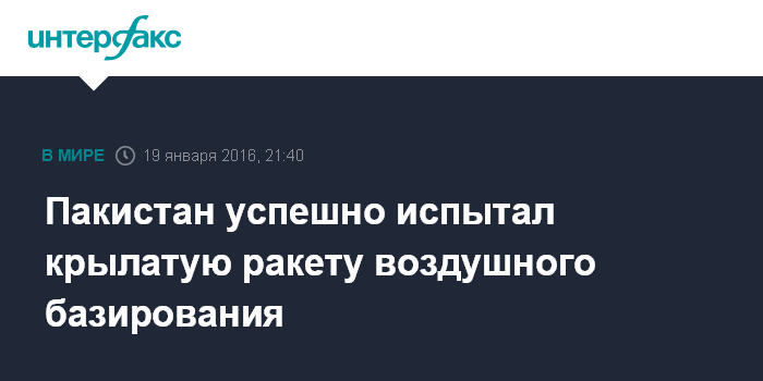 Москва. 19 января. INTERFAX.RU - Пакистан провел успешное испытание новой крылатой ракеты воздушного базирования "Раад", дальность действия которой составляет 350 км, сообщает во вторник пакистанское телевидение со ссылкой на заявление пакистанских военных.