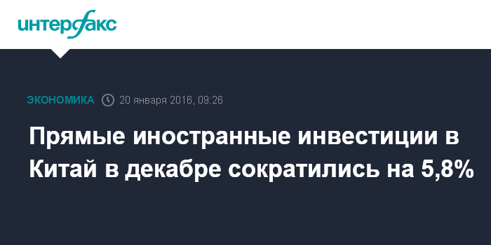 Москва. 20 января. INTERFAX.RU – Прямые иностранные инвестиции (foreign direct investment, FDI) в экономику Китая в декабре 2015 года сократились на 5,8% по сравнению с тем же месяцем предыдущего года, свидетельствуют официальные данные. Объем FDI составил 77 млрд юаней ($12 млрд).
