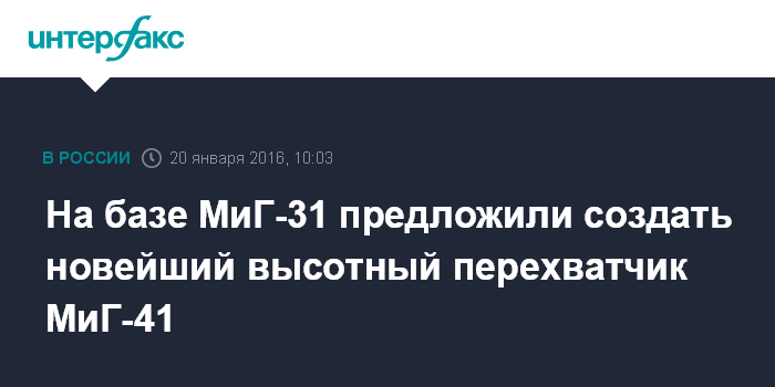 Москва. 20 января. INTERFAX.RU - Высотный истребитель-перехватчик МиГ-31, который по оценке специалистов до сих пор не имеет аналогов в мире, может стать базой для создания новейшего высотного боевого самолета МиГ-41, заявил "Интерфаксу" в среду член комитета Госдумы по обороне Александр Тарнаев.