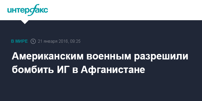Москва. 21 января. INTERFAX.RU - Администрация президента США Барака Обамы расширила полномочия американских войск в Афганистане, предоставив им право нанесения авиаударов по боевикам террористической группировки "Исламское государство" (ИГ, запрещена в РФ), сообщает газета The Washington Post со ссылкой на местные власти.