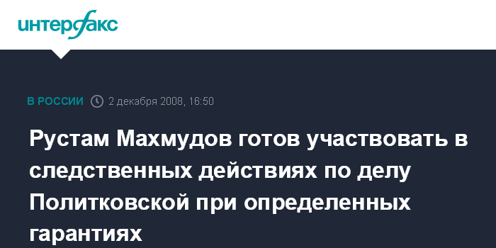 Москва. 2 декабря. INTERFAX.RU - Находящийся в розыске предполагаемый убийца обозревателя "Новой газеты" Анны Политковской Рустам Махмудов готов явиться к следователю по этому делу и участвовать в следственных действиях, если ему будут даны определенные гарантии, заявляет адвокат одного из фигурантов уголовного дела Мурад Мусаев.