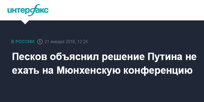 Москва. 21 января. INTERFAX.RU - Пресс-секретарь президента РФ Дмитрий Песков объяснил неучастие Владимира Путина в Мюнхенской конференции по безопасности.