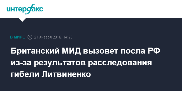 Москва. 21 января. INTERFAX.RU - Министр внутренних дел Великобритании Тереза Мэй заявила, что в МИД Великобритании вызовут посла РФ в Лондоне Александра Яковенко.