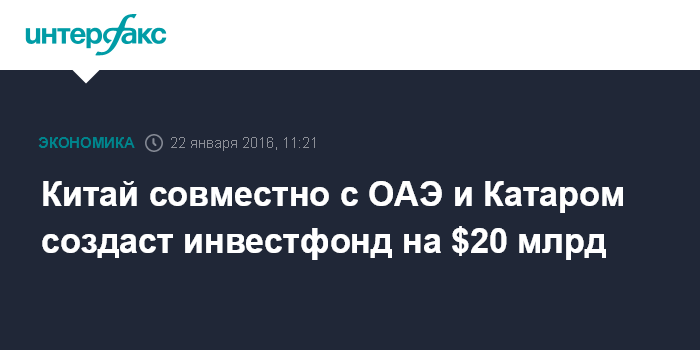 Москва. 22 января. INTERFAX.RU – Китай создаст фонд общих инвестиций объемом $20 млрд совместно с ОАЭ и Катаром, заявил председатель КНР Си Цзиньпин.