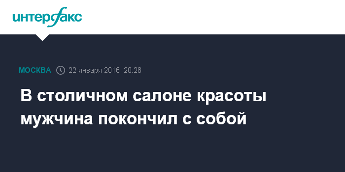 Москва. 22 января. INTERFAX.RU - Следователи проводят проверку по факту самоубийства мужчины в одном из столичных салонов красоты, сообщила официальный представитель ГСУ СК РФ по Москве Юлия Иванова.
