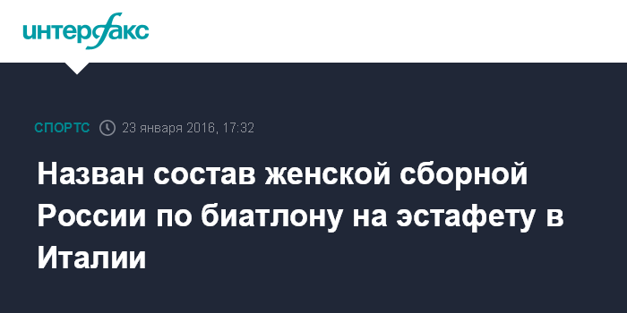 Москва. 23 января. INTERFAX.RU - Союз биатлонистов России (СБР) огласил состав женской сборной, которая примет участие в эстафетной гонке на шестом этапе Кубка мира по биатлону.