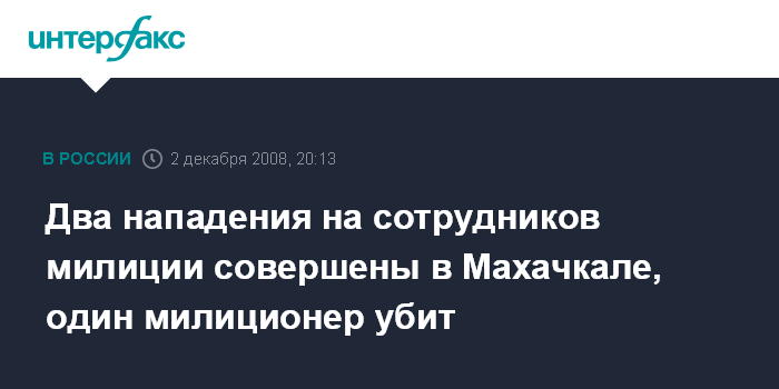 Москва. 2 декабря. INTERFAX.RU - В Махачкале совершены два нападения на милиционеров, один из них погиб, по предварительным данным, убит также один из нападавших, сообщили "Интерфаксу" в пресс-службе УВД города во вторник.