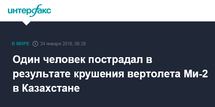 Москва. 24 января. INTERFAX.RU - В Жамбылской области Казахстана в результате крушения вертолета Ми-2 госпитализирован один человек.