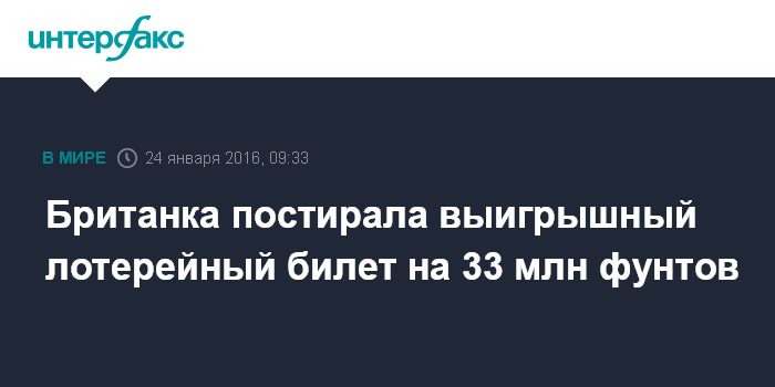 Москва. 24 января. INTERFAX.RU - Жительница Великобритании заявила, что постирала лотерейный билет, который, по ее мнению, принес ей выигрыш в 33 млн фунтов (около $47 млн), сообщает The Times.