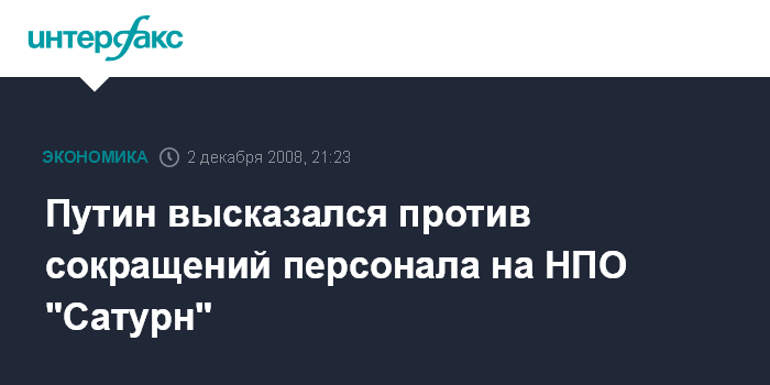 Москва. 2 декабря. INTERFAX.RU - Премьер-министр РФ Владимир Путин заявляет о недопустимости массовых сокращений на НПО "Сатурн".