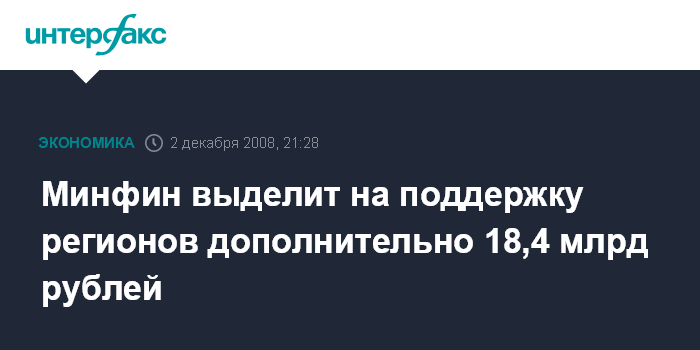 Москва. 2 декабря. INTERFAX.RU - Минфин России принял решение дополнительно выделить регионам 18,4 млрд рублей до конца 2008 г. из фонда сбалансированности бюджетов субъектов РФ, сообщил премьер-министр России Владимир Путин.