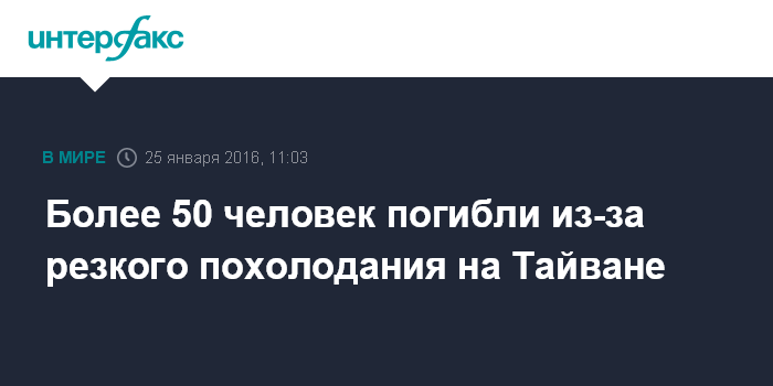 Москва. 25 января. INTERFAX.RU - В результате резкого похолодания в Восточной Азии на Тайване погибли более 50 человек, сообщает "Би-би-си".