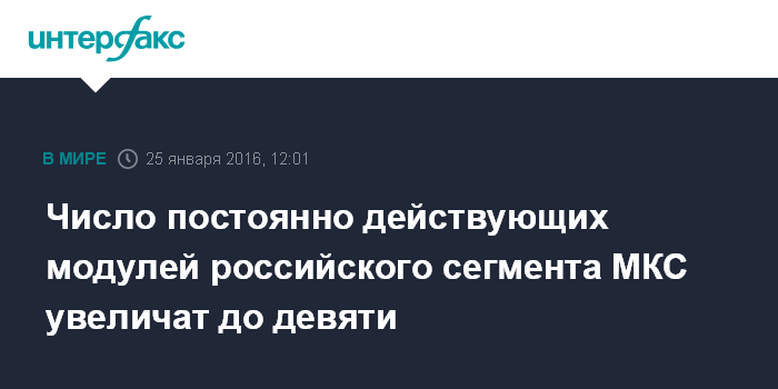 Москва. 25 января. INTERFAX.RU - Россия до 2019 года увеличит число постоянно действующих модулей российского сегмента Международной космической станции (МКС) с шести до девяти, сообщили в понедельник "Интерфаксу" в российской ракетно-космической отрасли.