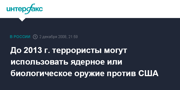 Москва. 2 декабря. INTERFAX.RU - США могут ожидать террористического нападения с использованием ядерного, или что более вероятно биологического оружия до 2013 года. Такие данные содержатся в докладе, подготовленном двупартийной комиссией и переданном во вторник избранному вице-президенту США Джо Байдену.
