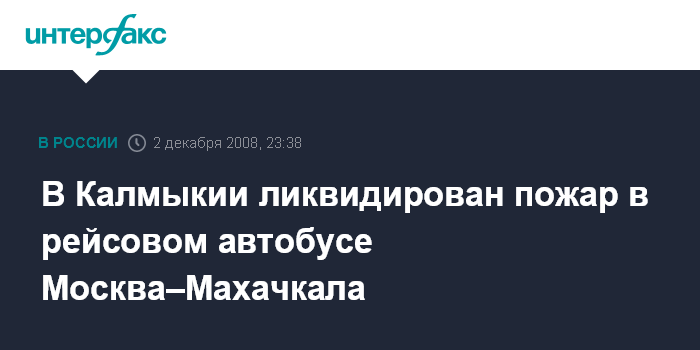 Ростов-на-Дону. 2 декабря. ИНТЕРФАКС-ЮГ - В рейсовом автобусе Москва-Махачкала на автотрассе Комсомольский - Артезиан (Республика Калмыкия) произошел пожар, жертв и пострадавших нет.
