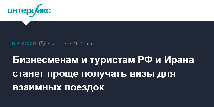 Москва. 25 января. INTERFAX.RU - Межправсоглашение между Россией и Ираном об упрощении условий взаимных поездок отдельных категорий граждан двух стран вступает в силу 6 февраля, сообщает МИД РФ.