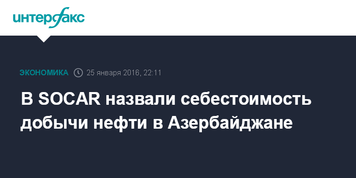 Москва. 25 января. INTERFAX.RU - Добыча нефти на морских и сухопутных месторождениях Азербайджана обходится госкомпании SOCAR в среднем в 20 долларов за баррель. Об этом рассказал вице-президент компании по инвестициям и маркетингу Эльшад Насиров, передает Trend.