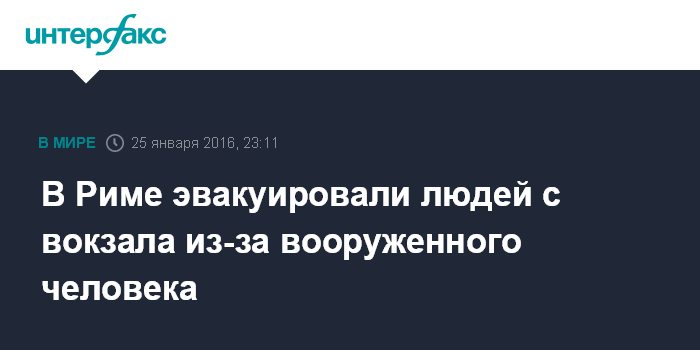 Москва. 25 января. INTERFAX.RU - Итальянская полиция провела в понедельник вечером эвакуацию людей с вокзала "Термини" в Риме в связи с сообщениями о присутствии там вооруженного ружьем мужчины, сообщают местные СМИ.